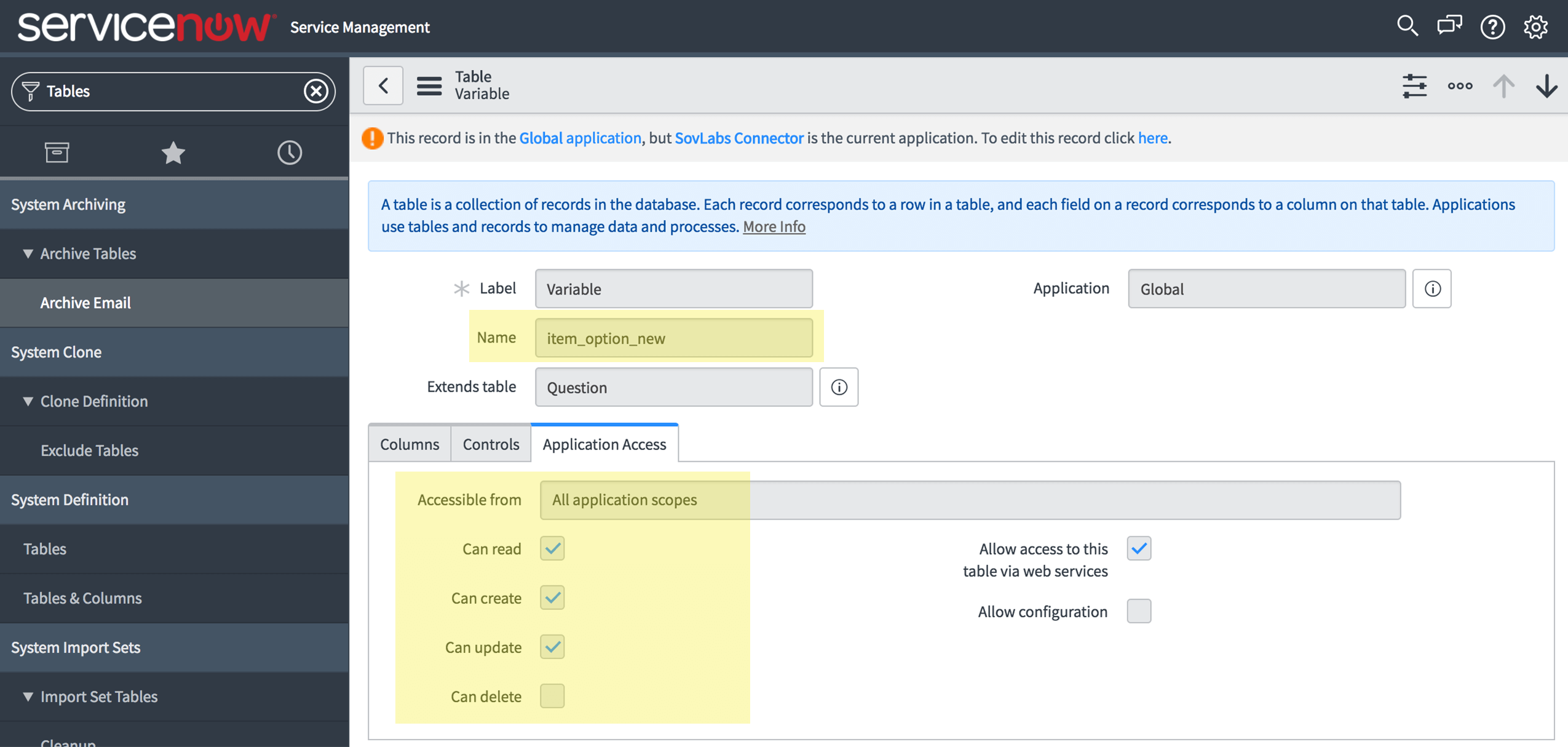 - Set All Application Access for tables: