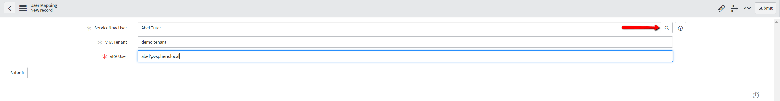 In the event the User account names in ServiceNow do not match the user accounts names in the vRA Tenant, a User Mapping wizard has been provided to link Users to the correct accounts between ServiceNow and vRA. To configure follow the steps below.